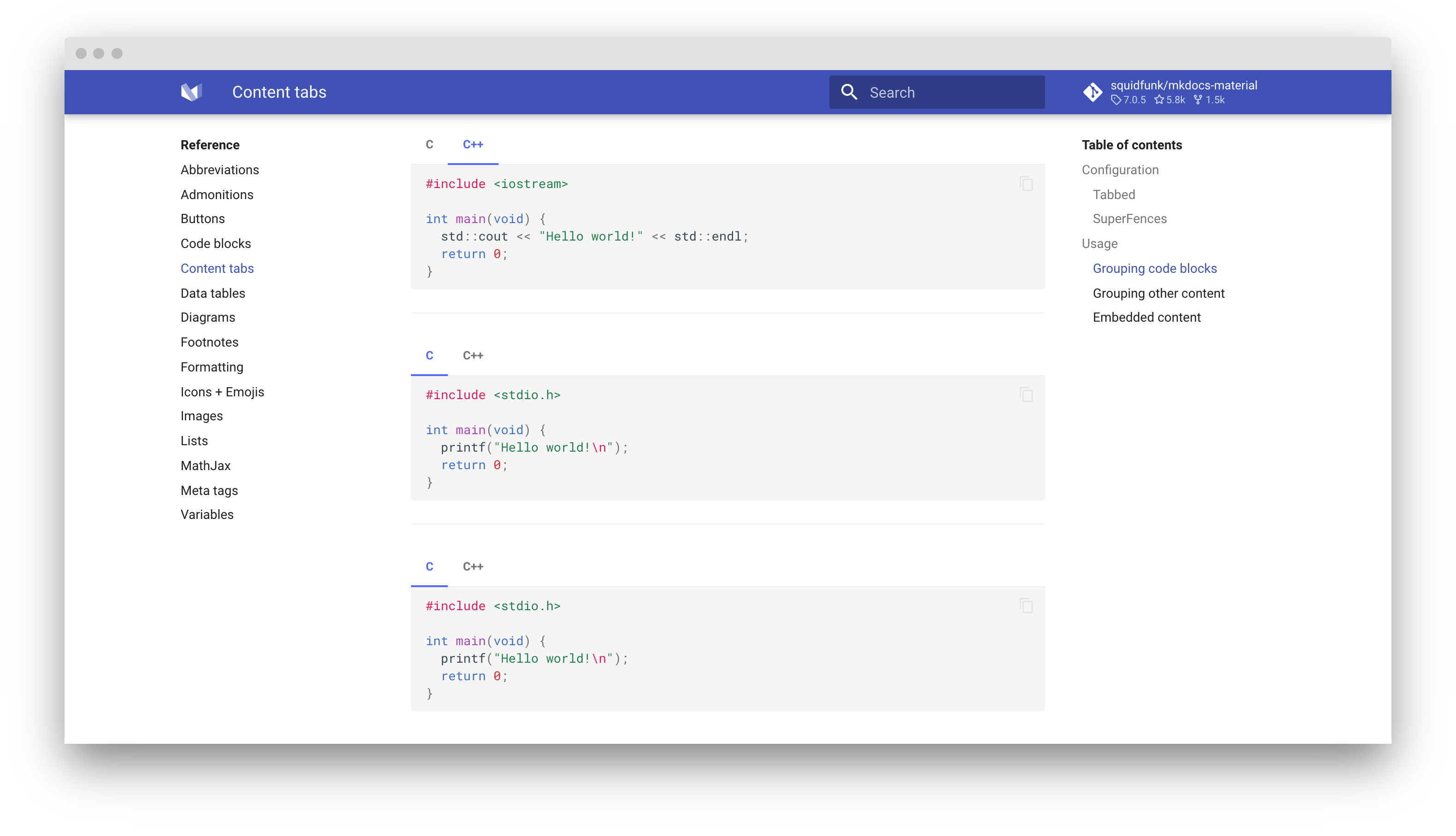 有时,将不同的内容分组到不同的标签下是很有必要的,例如在描述如何从不同的语言或环境访问 API 时。Material for MkDocs 允许创建美观且功能强大的标签,以分组代码块和其他内容。